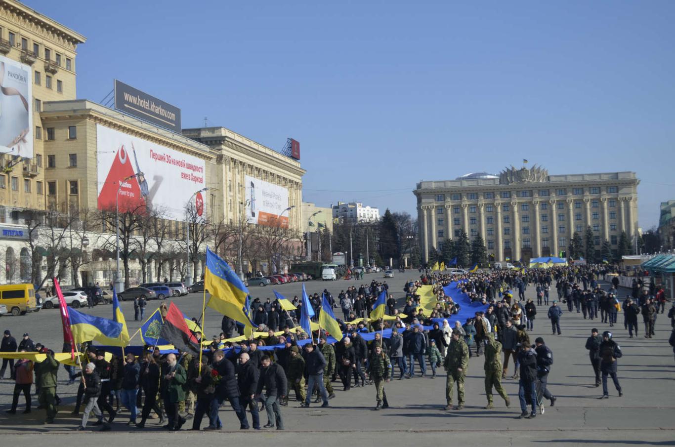 По завершенню учасники акції розгорнули 100-метровий прапор України та у супроводі кількох десятків поліцейських пройшлися центральною вулицею міста до каменю Героїв, який розташований неподалік Держпрома.