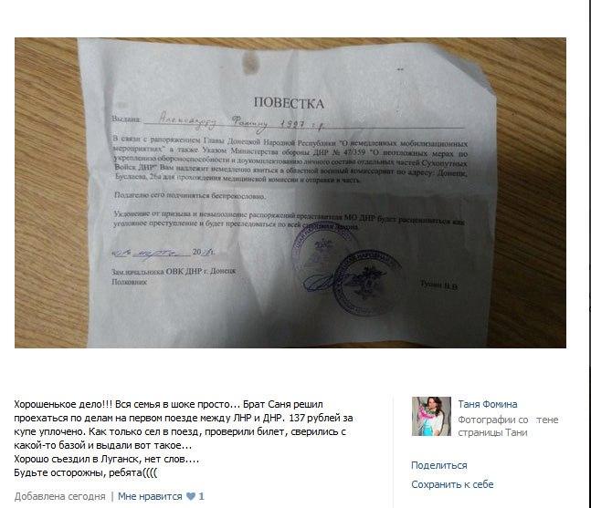 Під фотографією з так званою «повісткою» дівчина пояснює, що її вручили братові, коли той вчора вирішив проїхатись потягом з Ясинуватої до Луганська. Після перевірки по базах хлопцю видали цей «документ».