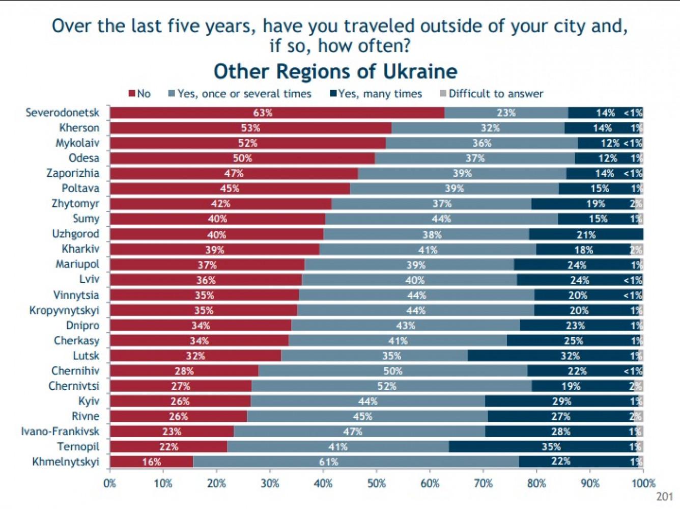 Опитування також включало питання, наскільки часто мешканці подорожували. Так от у Чернігові та Чернівцях 50% та 52% людей відповіли, що за п’ять років декілька раз подорожували. Найвищій відсоток людей, які часто подорожують живе у Тернополі – 35%.