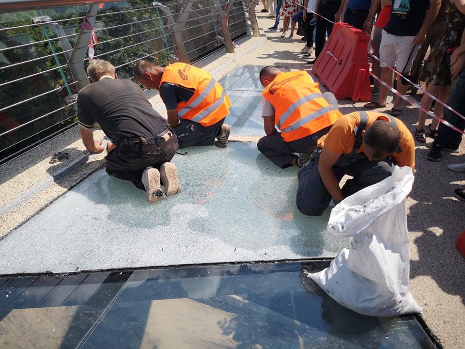 «Робітники нині працюють над заміною трьох скляних фрагментів. Спершу пошкоджені були дві з них, проте під час їхньої заміни тріщини пішли і по третьому фрагменту мосту», — повідомляє кореспондент.