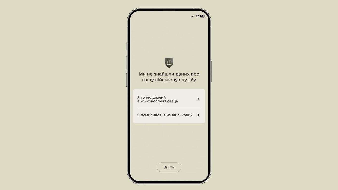 - Якщо інформація в реєстрі відсутня, на екрані з’явиться повідомлення «Ми не знайшли даних про вашу військову службу», тоді натисніть «Я точно чинний військовий»;