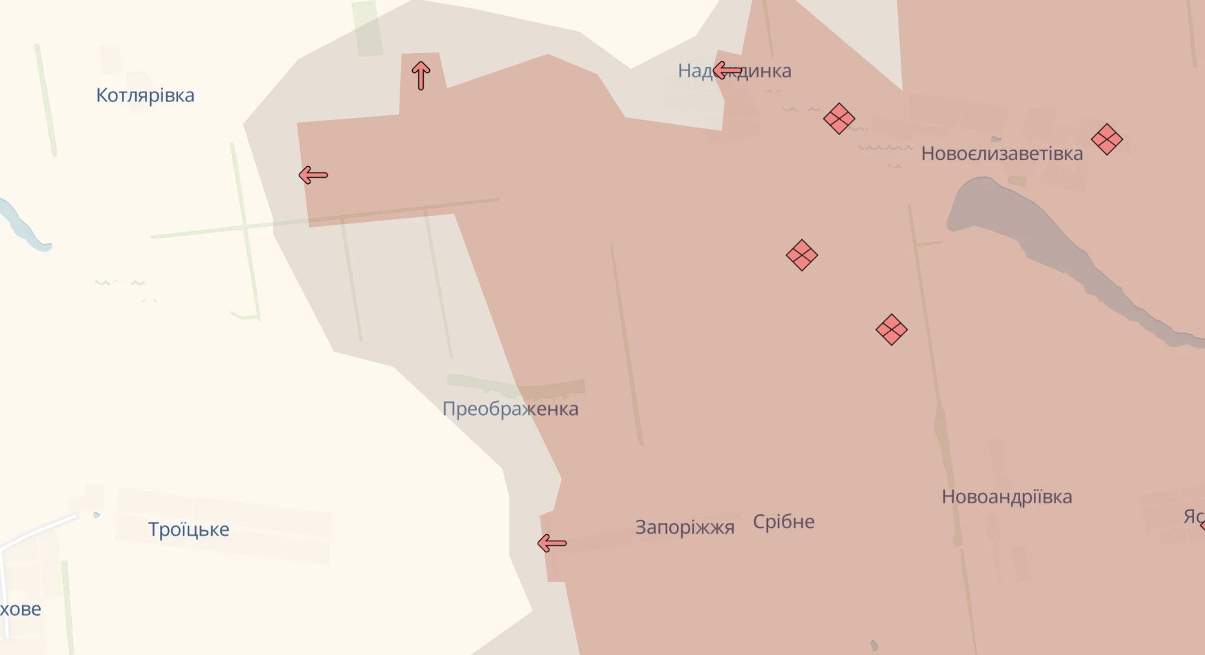 Роман Погорілий додає: «І якраз ця ділянка, на сьогоднішній день, починаючи від населеного пункту Надія (на мапі DeepState можна побачити як Надеждинка), от від цього населеного пункту, по відтинку Котлярівка, Преображенка, Запоріжжя дуже важка ситуація. Ворог там здійснює активні штурмові дії».