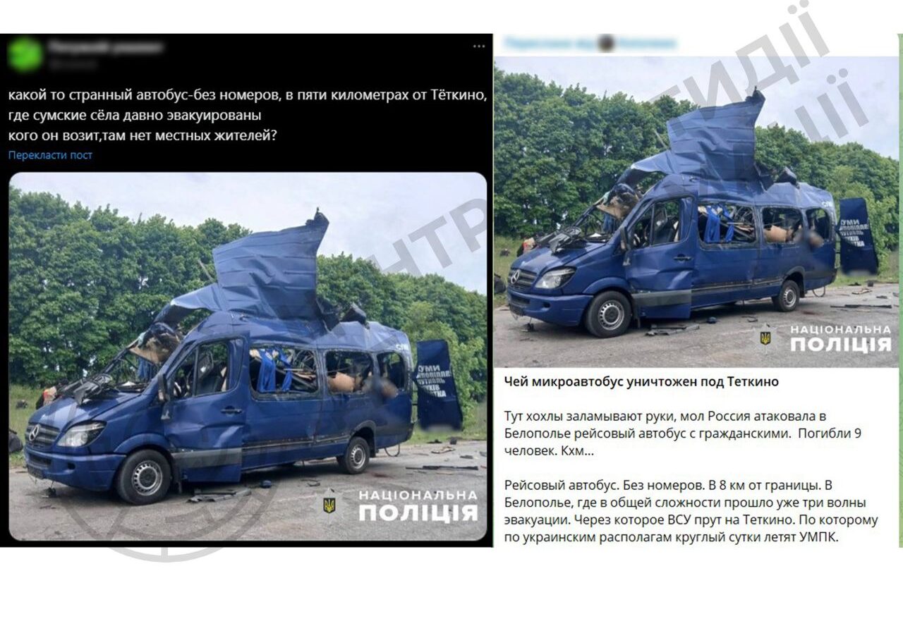 Російські пропагандисти поширюють дезінформацію про буцімто удар безпілотником по «рейсовому автобусу без номерів під Тьоткіно». Ворог намагається переконати, що атака росіян по цивільному автобусу на Сумщині була спрямована не по мирному населенню, а по військових — нібито через активні бойові дії на Курщині.