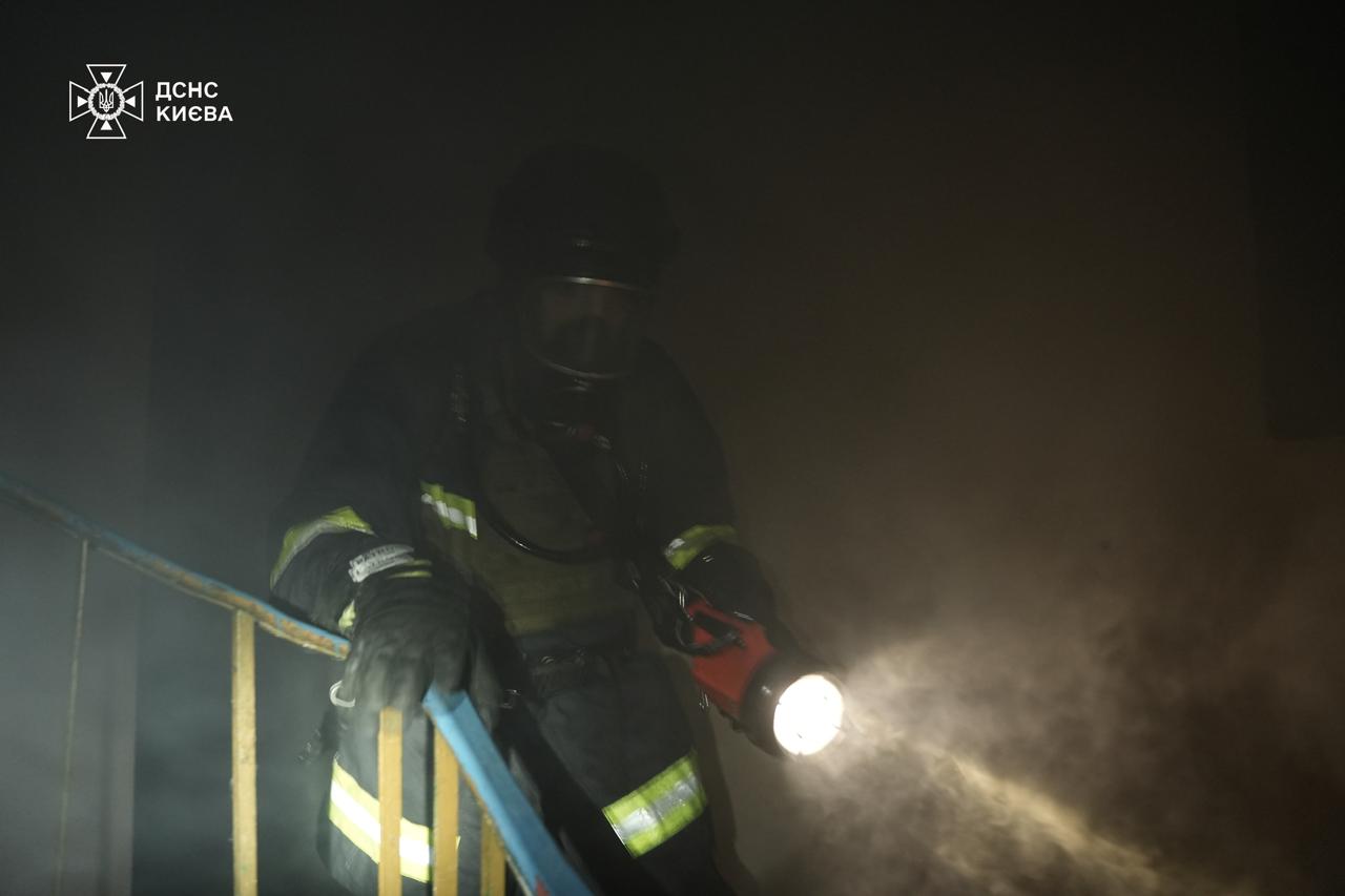 Пожежник у задимленому під’їзді після російської атаки по Києву 24 травня 2025/Фото: ДСНС