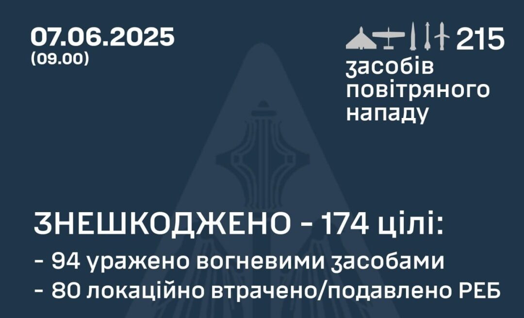 Із 22:00 п’ятниці, 6 червня, росіяни атакували Україну 215 засобами повітряного нападу:
