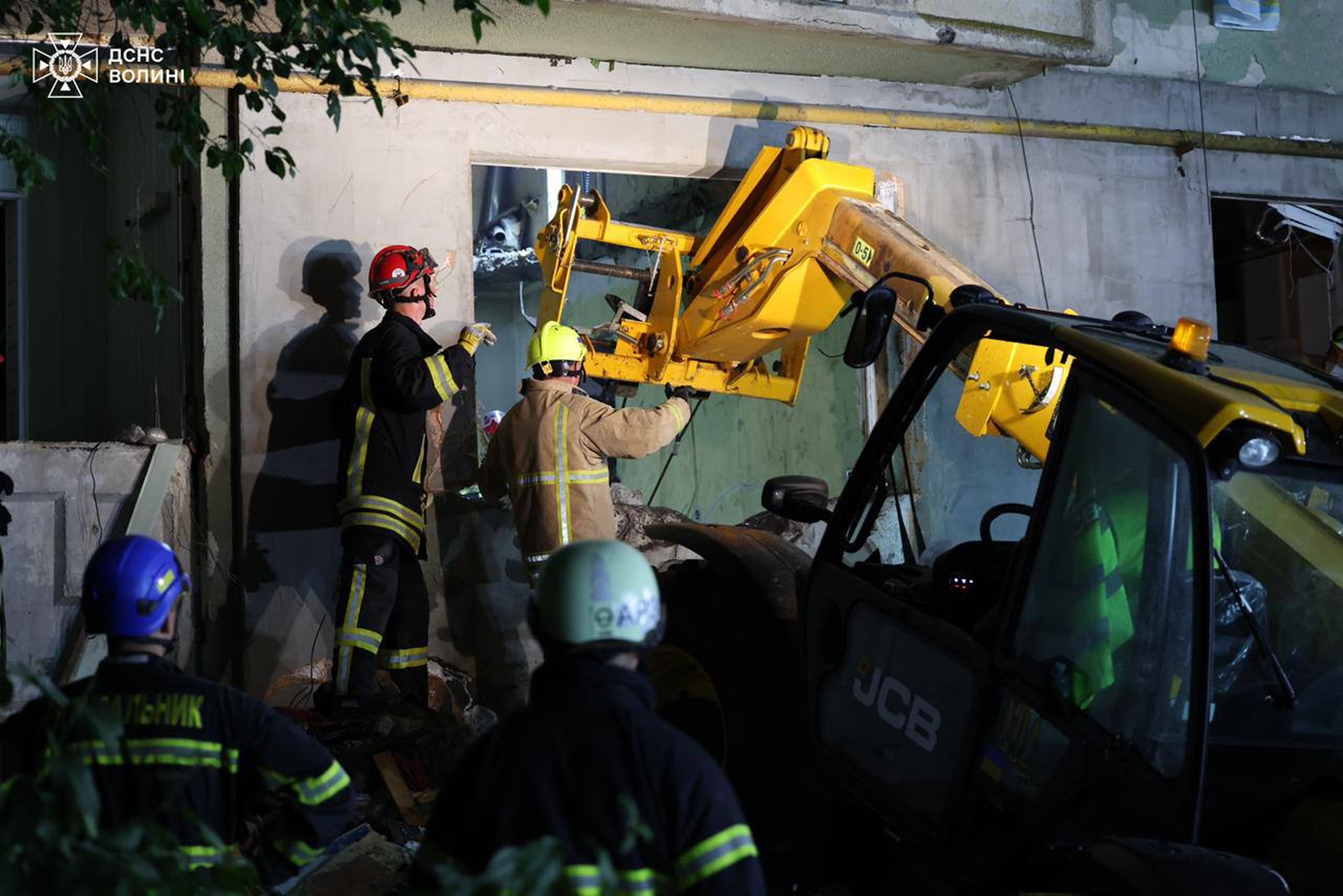 Рятувальники біля зруйнованої російським ударом стіни багатоповерхівки в Луцьку/Фото: ДСНС