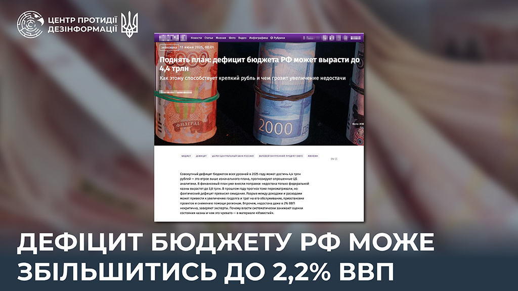 Центр протидії дезінформації наголошує: «Через небажання Кремля зупинити війну економіка Росії й далі занепадає, а дефіцит бюджету зростає. Усе це дедалі сильніше впливатиме на рівень життя росіян.