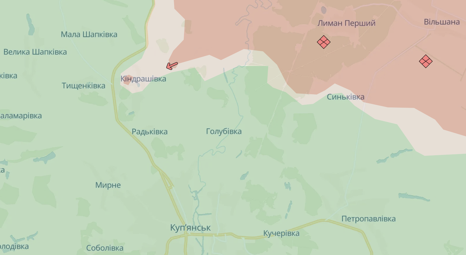 Кіндрашівка та Куп'янськ на скриншоті з мапи DeepState, 16 червня 2025