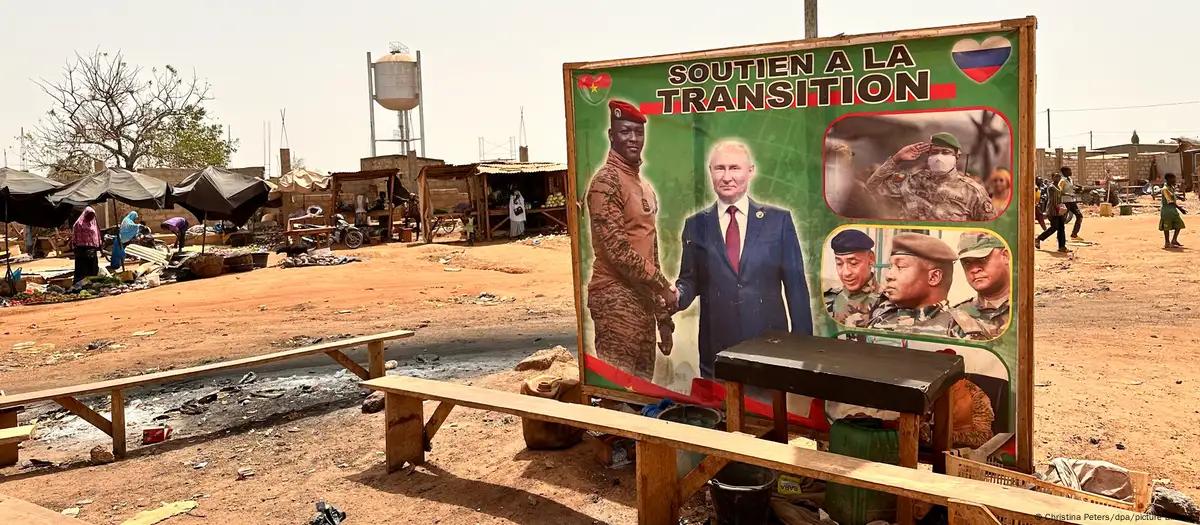 Плакат у столиці Буркіна-Фасо Уагадугу закликає до "підтримки змін". На ньому зображені лідер місцевої хунти Ібрагім Траоре і Путін/Фото: Christina Peters/dpa/picture allianceРосія активно розширює свій вплив на інформаційний простір Африки, використовуючи державні медіаресурси для просування кремлівської пропаганди.