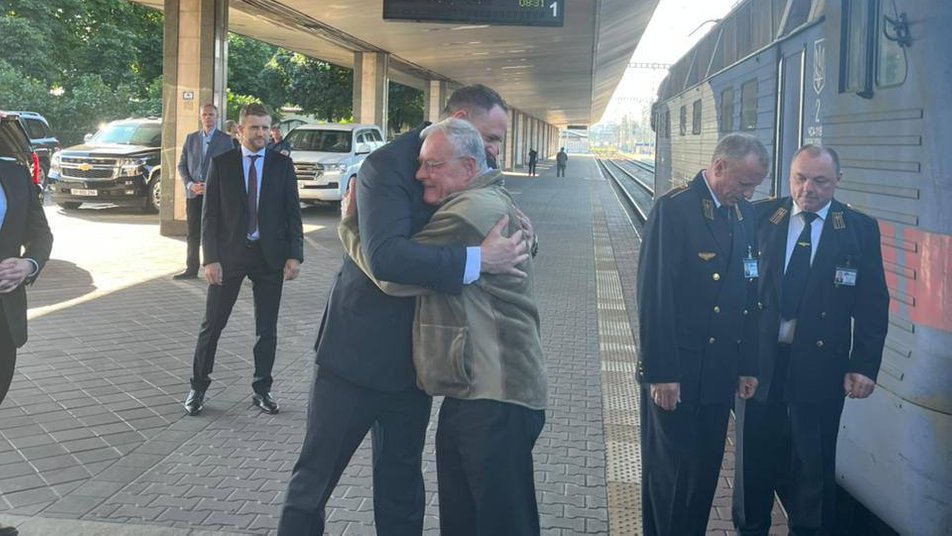 Керівник Офісу президента України Андрій Єрмак зустрів представника США з питань України та Росії Кіта Келлога на вокзалі в Києві, Україна, 14 липня 2025 року. Telegram/Андрій Єрмак