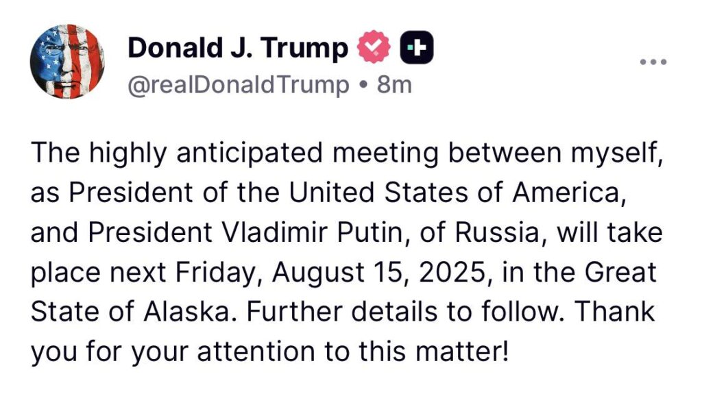 Він заявив, що довгоочікувана зустріч між ним та Путіним відбудеться наступної п’ятниці «у великому штаті Аляска».