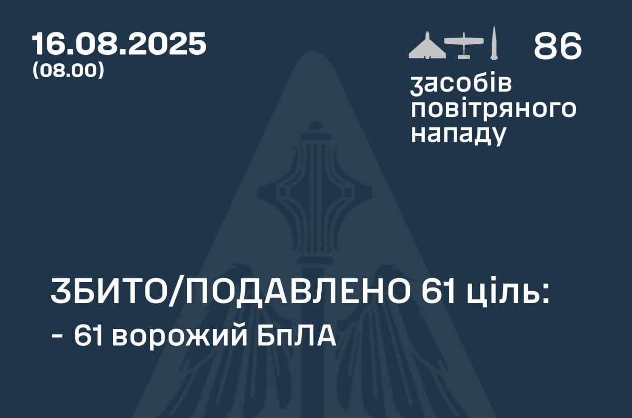 «За попередніми даними, станом на 08.00, протиповітряною обороною збито/подавлено 61 ворожий БпЛА типу Shahed і дрони-імітатори різних типів на півночі та сході країни. Зафіксовано влучання ракет та 24 БпЛА на 12 локаціях», — розповіли у Повітряних силах.