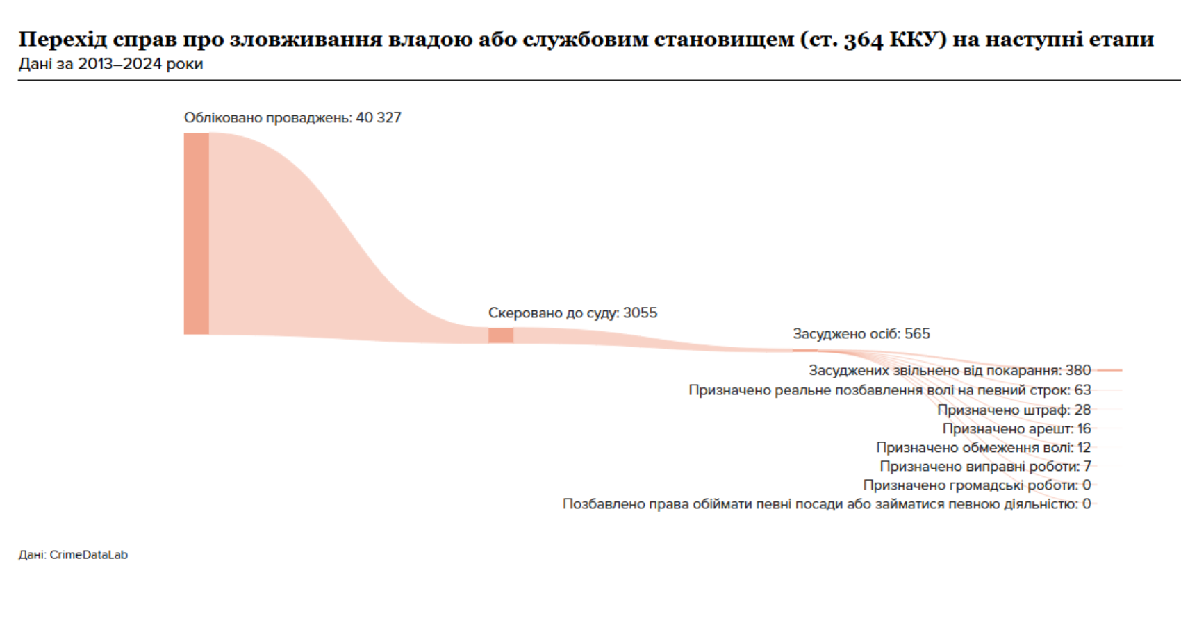 Ще показовіша стаття 364 («Зловживання владою або службовим становищем»). Із понад 40 тис. проваджень до суду дійшло менш як 10% — лише 3 тис. Реальне покарання у вигляді позбавлення волі отримали лише 63 особи, обмеження волі — 12, штраф — 28, арешт — 16 осіб.