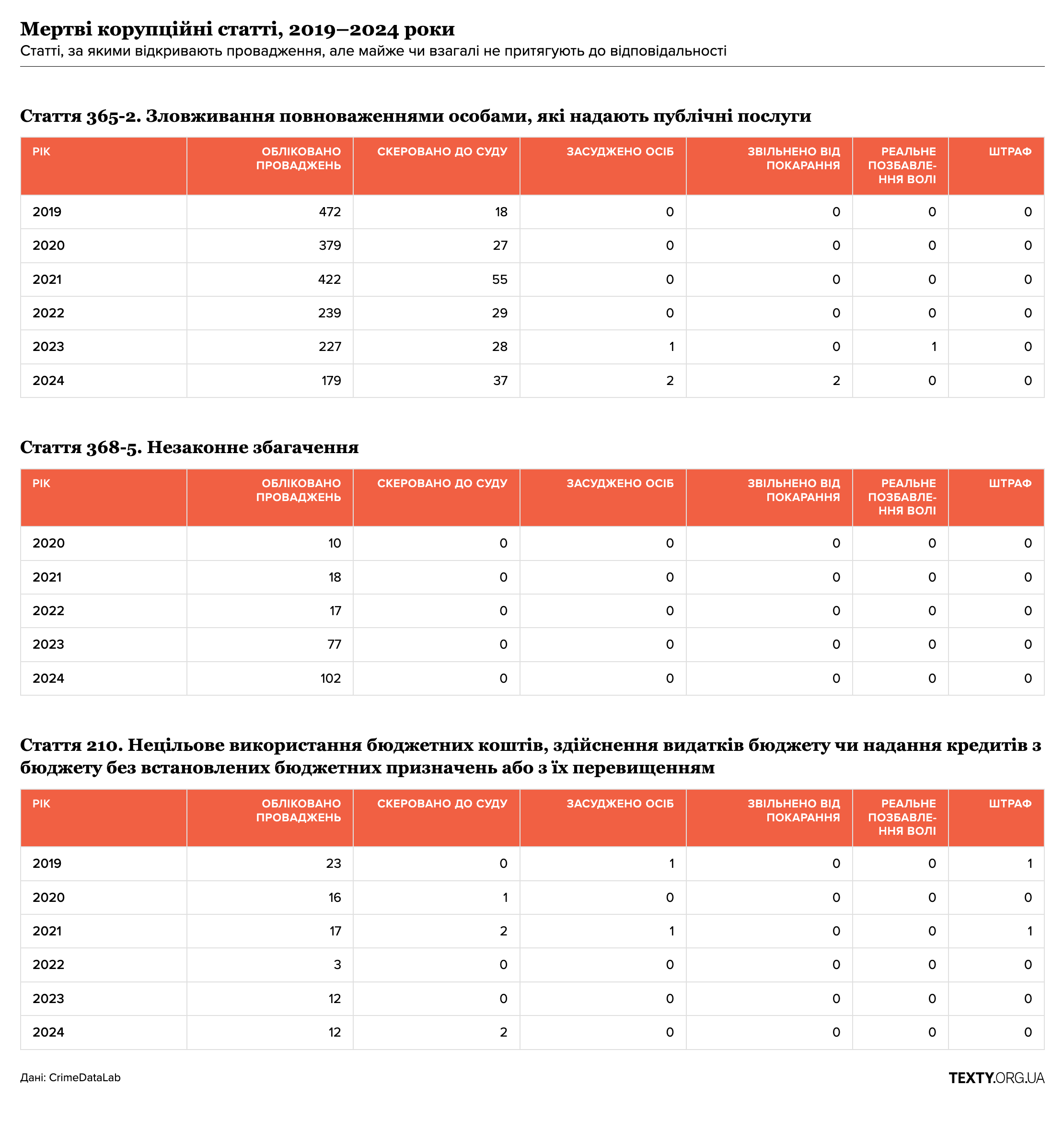 Також за останні пʼять років серед сотень порушених справ за статтею 365-2 («Зловживання повноваженнями особами, які надають публічні послуги») засудили одну особу (ще двох звільнили з умовним терміном), а за статтею 210 («Нецільове використання бюджетних коштів») — двох.