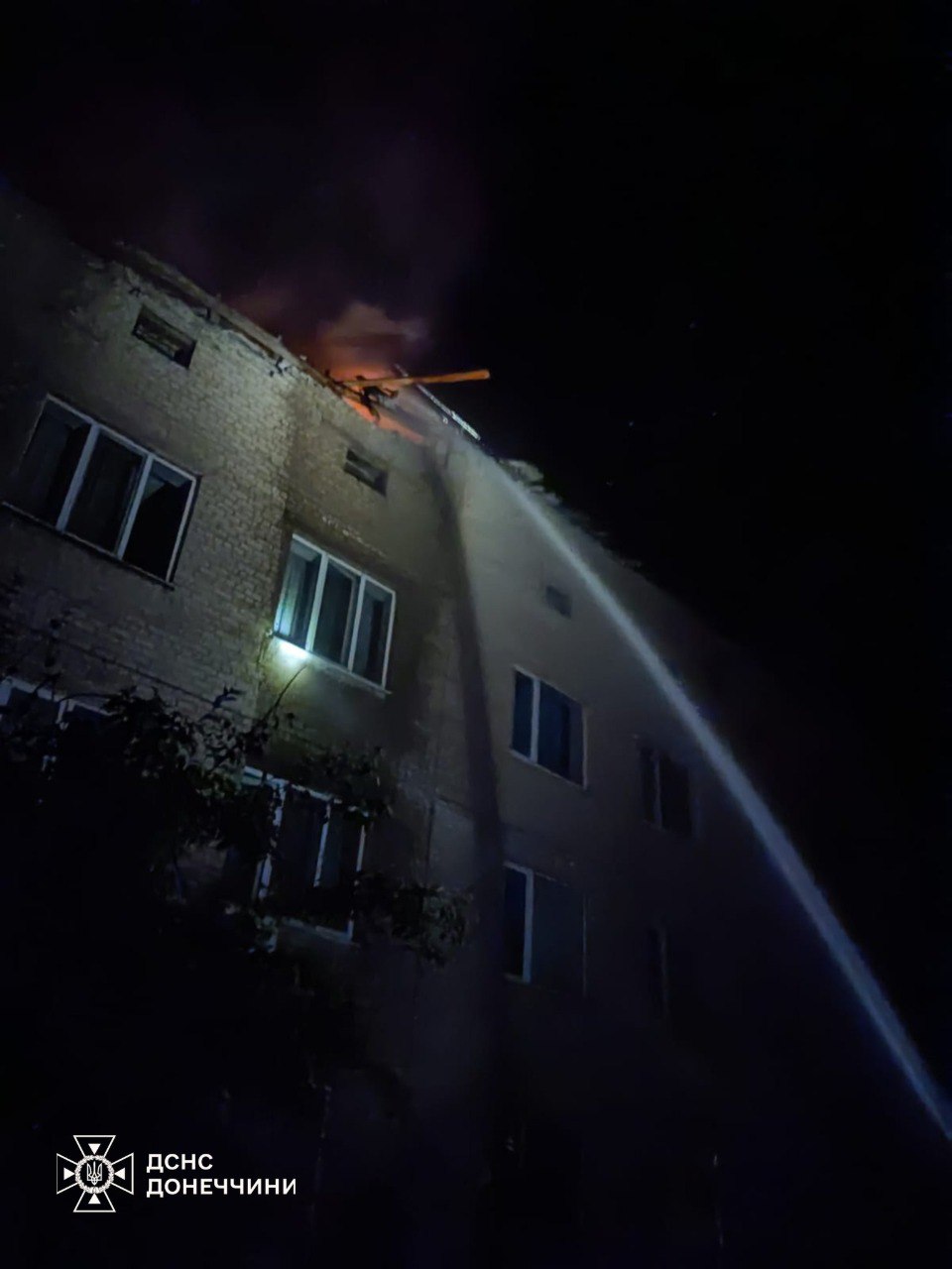 У Добропіллі через ворожий удар загинула 1 людина, ще 2 поранені. Пошкоджені 6 багатоповерхівок та адмінбудівля. Загорілася покрівля адмінбудівлі, рятувальники ліквідували пожежу.