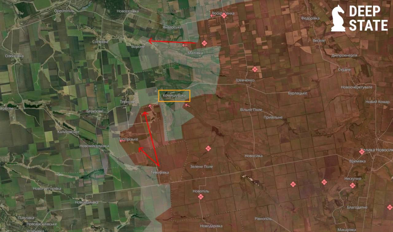 «На Запорізьке та Новогеоргіївку противник здійснює свій тиск зі сторони Зеленого Поля та села Темирівка, яке, хтось при першій фіксації просувань розглядав як потенційний рух в напрямку Гуляйполя, що очевидно не було таким, адже для ворога складається можливість просувань в тому районі з «ефектним» обходом Комишувахи та Маліївки, які вони ніяк не можуть взяти.