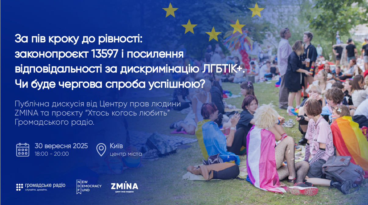 - 30 вересня 2025 року Центр прав людини ZMINA спільно з Громадським радіо запрошують на публічну дискусію, присвячену стану прав ЛГБТІК+-спільноти в Україні, безпеці активістів та активісток і необхідним законодавчим змінам.