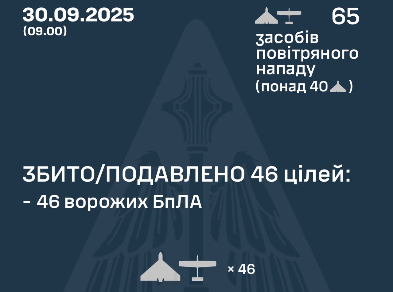 У ніч на 30 вересня російські окупанти атакували Україну 65-ма ударними БпЛА типу Shahed, Гербера і безпілотниками інших типів із різних напрямків Росії та з окупованого Криму. Понад 40 із них — шахеди.