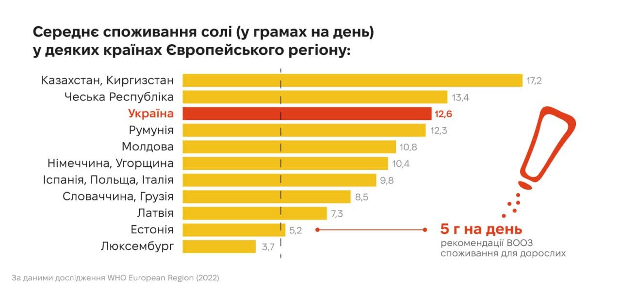 За даними дослідження STEPS, українці споживають на добу удвічі більше солі замість рекомендованої норми (у середньому 12,6 г при рекомендованих 5 г). Це серйозно шкодить здоров’ю: підвищує артеріальний тиск і збільшує ризик інфаркту та інсульту.
