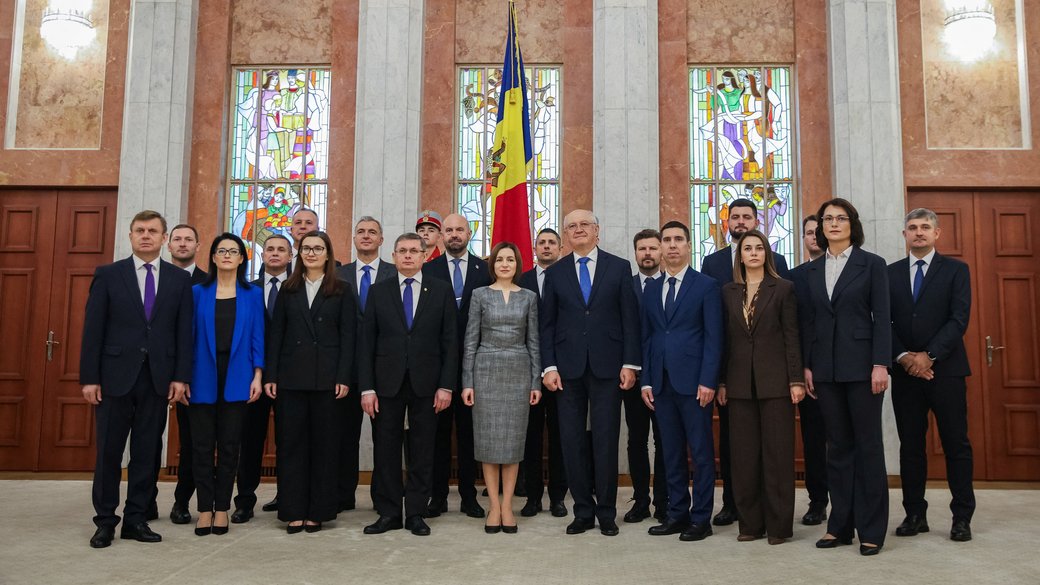Президентка Молдови Мая Санду, спікер парламенту Ігор Гросу, новий прем'єр-міністр Александру Мунтяну та членами нового уряду після церемонії складання присяги в Кишиневі, Молдова, 1 листопада 2025 року. REUTERS/Vladislav Culiomza