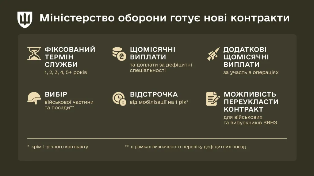 Наразі вся інформація, яка у нас є, це те, що зазначені контракти будуть 1-річними, 2-річними, 3-річними, 4-річними та 5-річними. Це офіційна інформація на сайті Міністерства оборони. Після проходження служби за подібним контрактом, окрім 1-річного, особа буде отримувати право на відстрочку, тобто відповідні зміни будуть вноситися також і до Закону України про військовий обов’язок і військову службу, і до Закону України про мобілізацію і мобілізаційну підготовку.