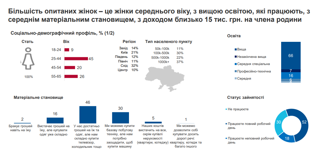 Половина жінок відчуває матеріальні труднощі та перевантаженість повсякденними обов’язками, а в результаті — брак часу та потреба у психологічній підтримці. При цьому потреба у додаткових знаннях та навичках — найменша в цьому контексті.
