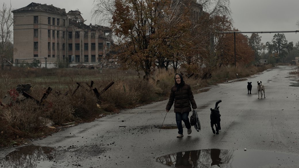 Літня жінка та собаки на вулиці Костянтинівки/Донеччина, 16 листопада 2025 року. Getty Images/Kostiantyn Liberov/Libkos