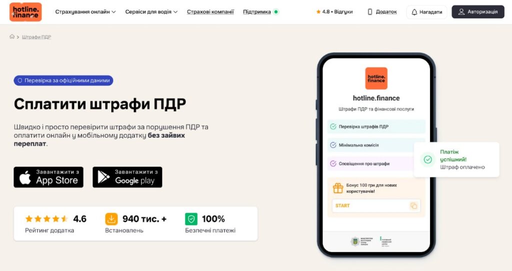 - Страхові агрегатори та спеціалізовані ресурси. Сучасні цифрові платформи для водіїв інтегровані з державними послугами. На прикладі мобільного додатка hotline finance користувачі можуть підключити відстеження даних за конкретним транспортним засобом, а також одразу сплатити штраф ПДР онлайн в межах одного сервісу.