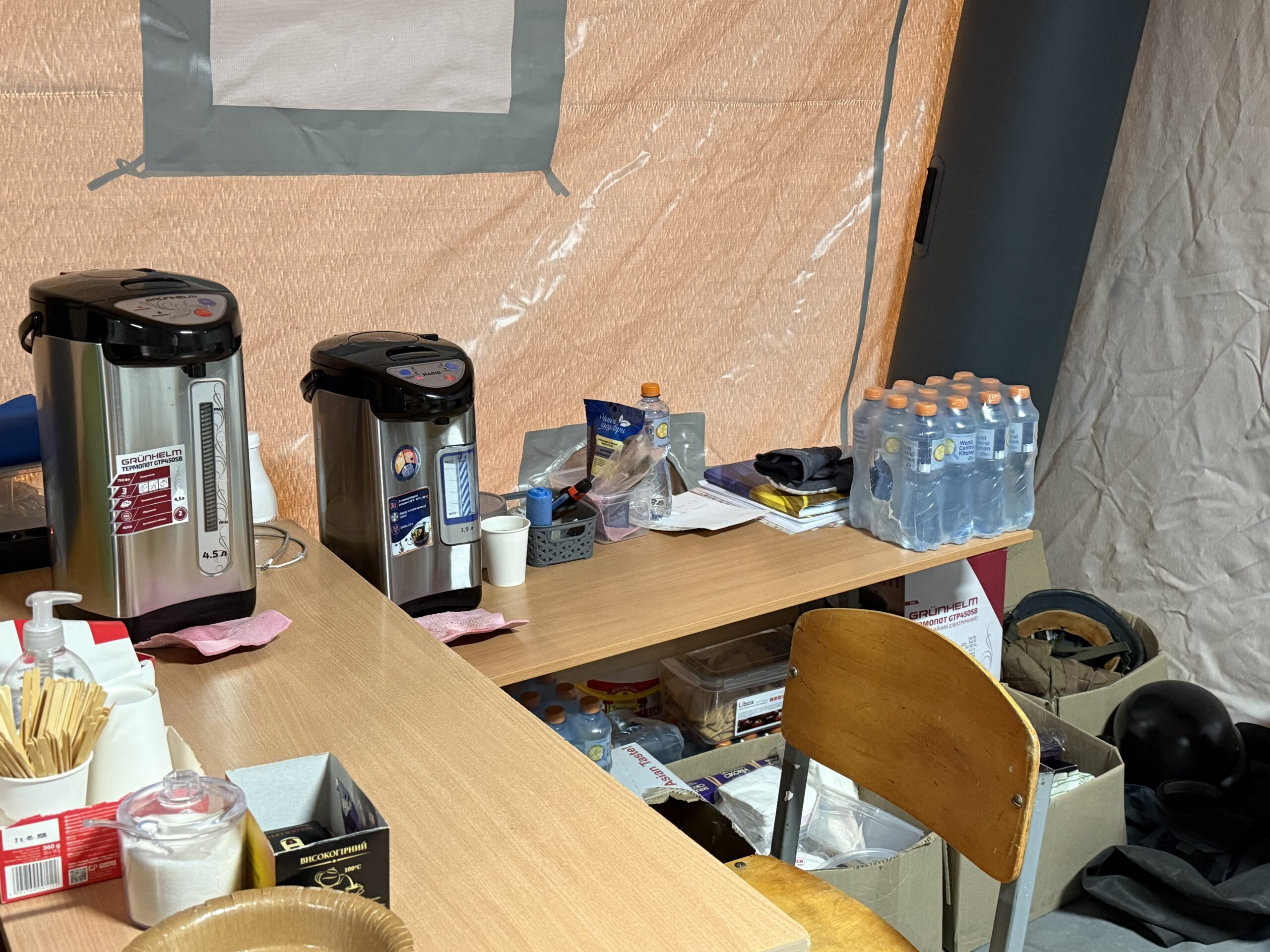 На столах у пункті розкладені антисептичні засоби, подовжувачі для зарядки електропристроїв, також можна пригоститись теплим чаєм/кавою, попити води. Посередині намету — низький столик з маленькими стільчиками — це місце для дітей.