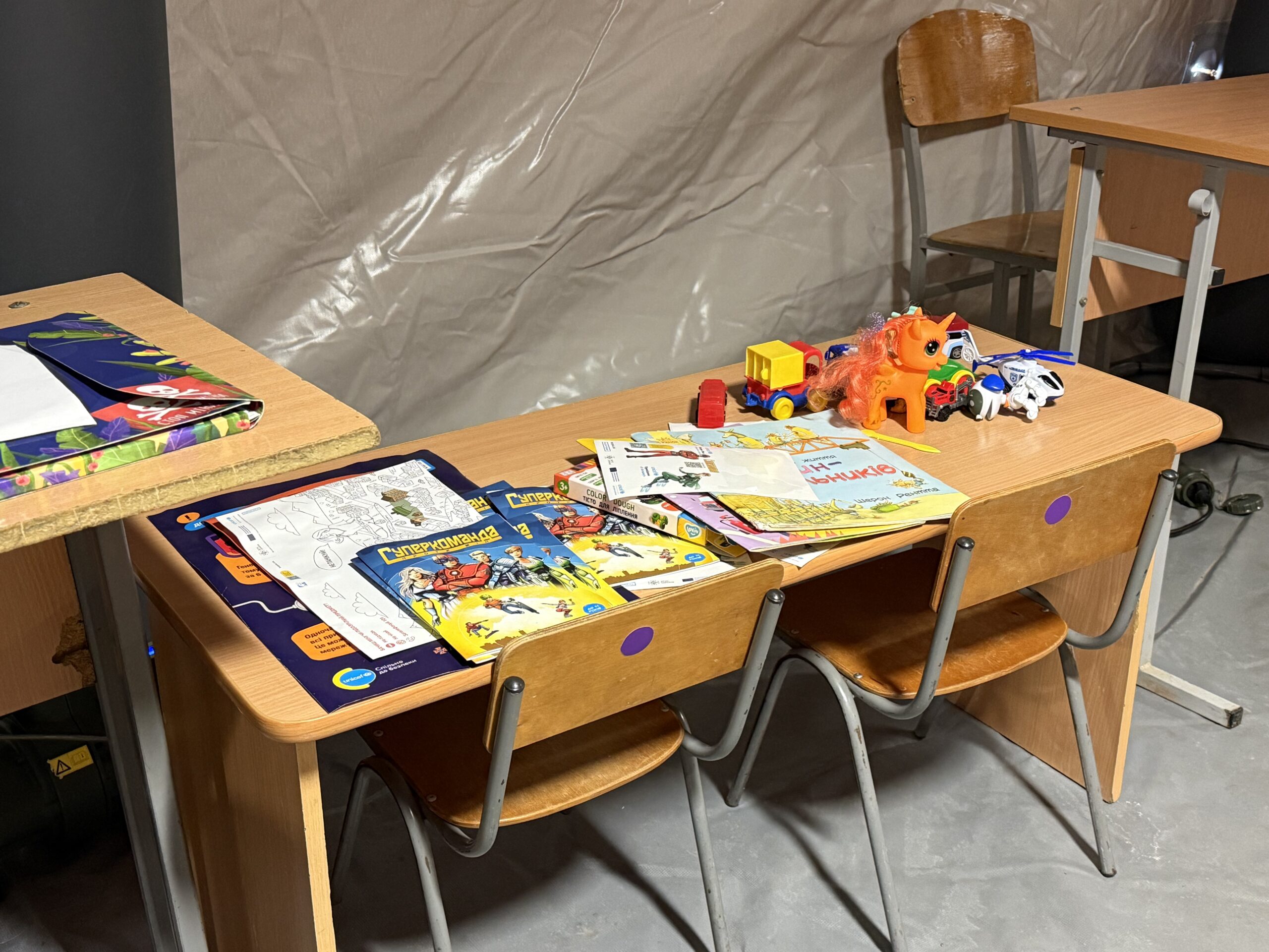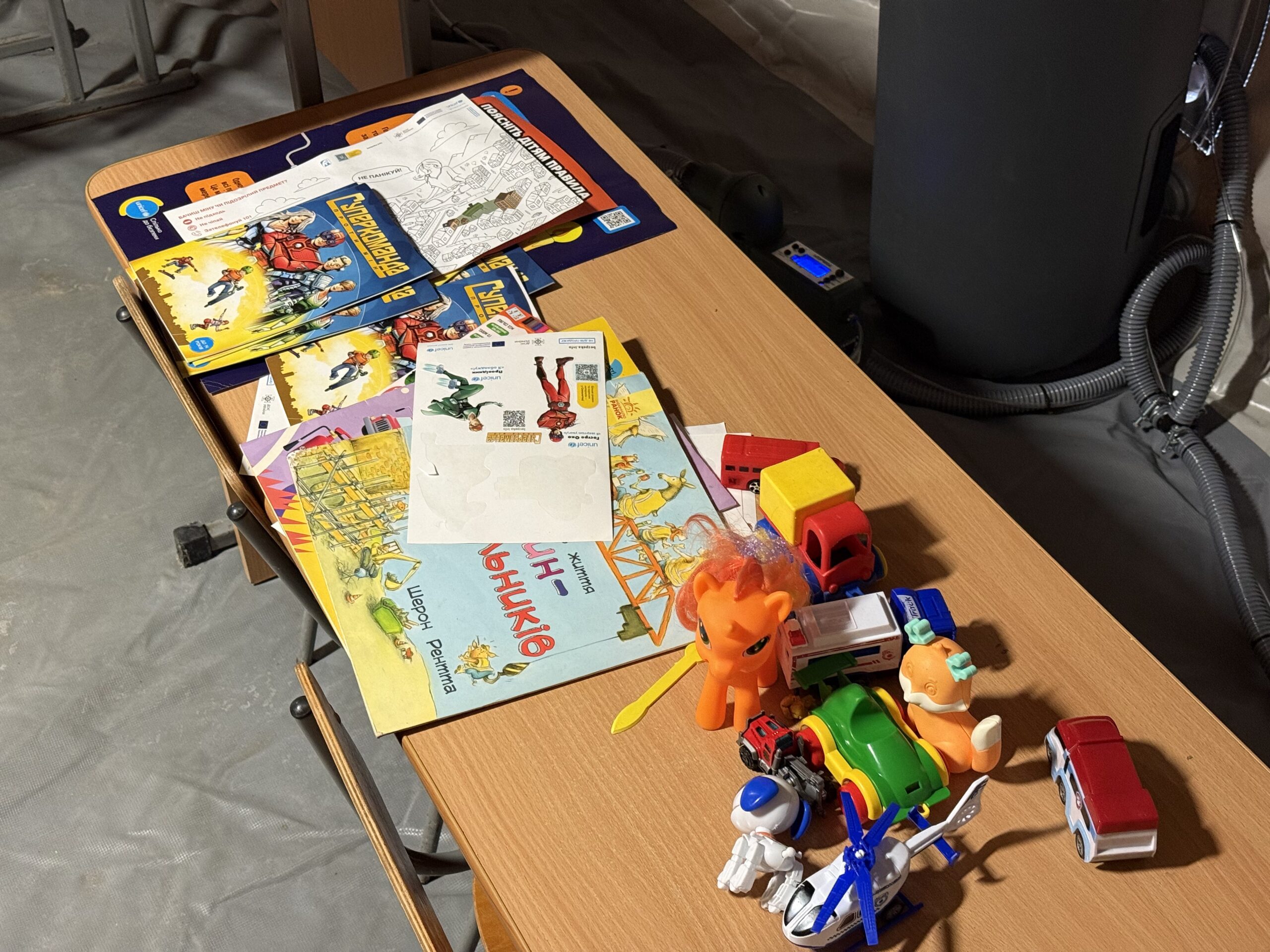 На ньому лежать розмальовки, олівців, фломастери, а також — іграшки, щоб малечі було чим зайнятись. Для дорослих же — газети та журнали. Як видно із заповнених сторінок кросвордів — кияни дійсно ними користуються, чекаючи поки зарядяться гаджети.
