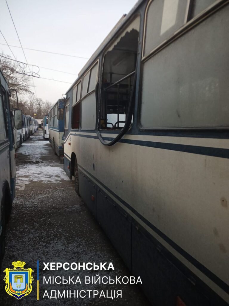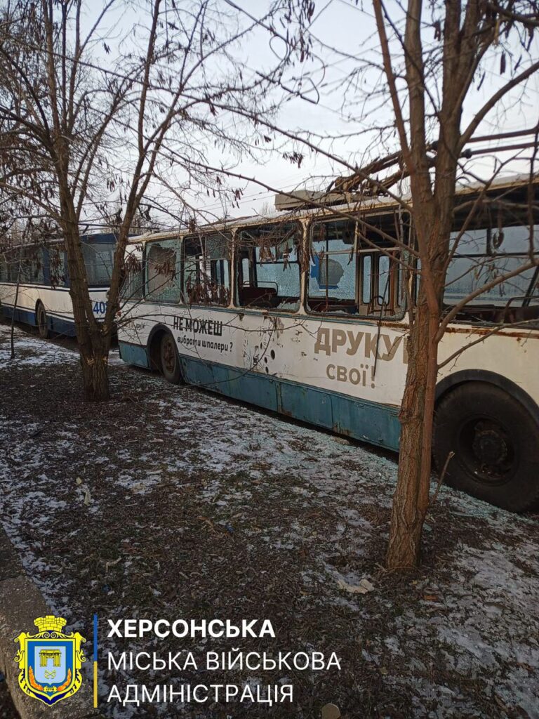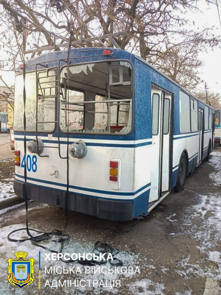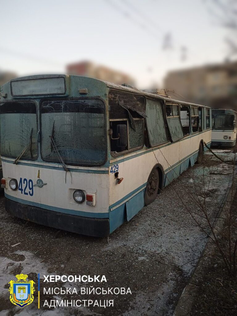 Пошкоджений внаслідок російського обстрілу тролейбус у Херсоні/Фото: Херсонська МВАРосійські війська обстріляли у Дніпровському районі Херсона комунальне підприємство, пошкоджені 12 одиниць транспорту.