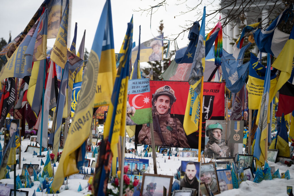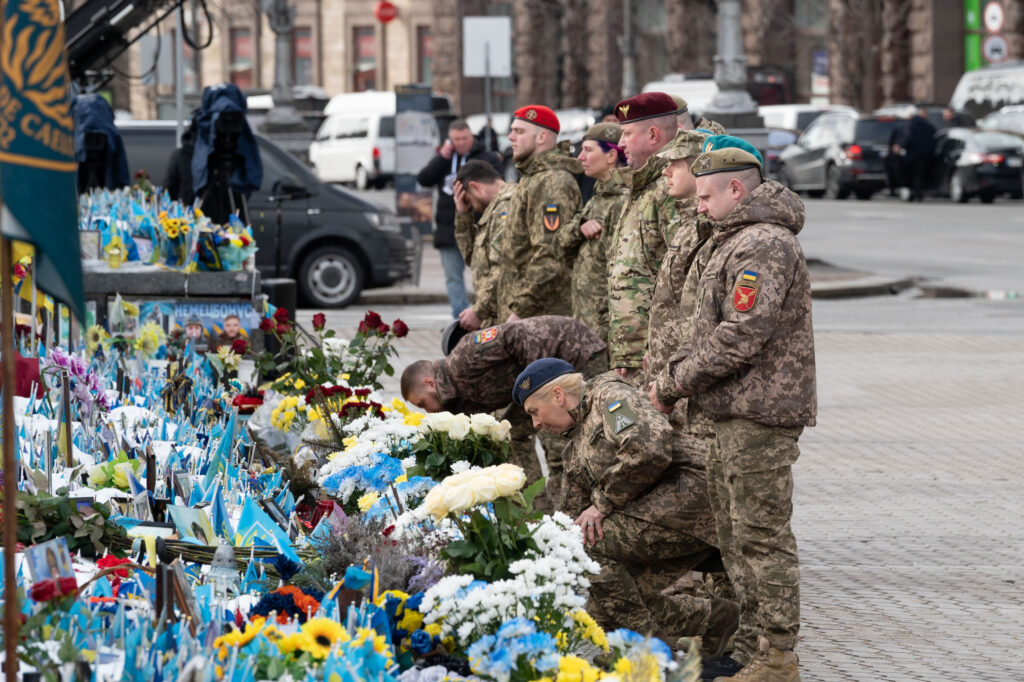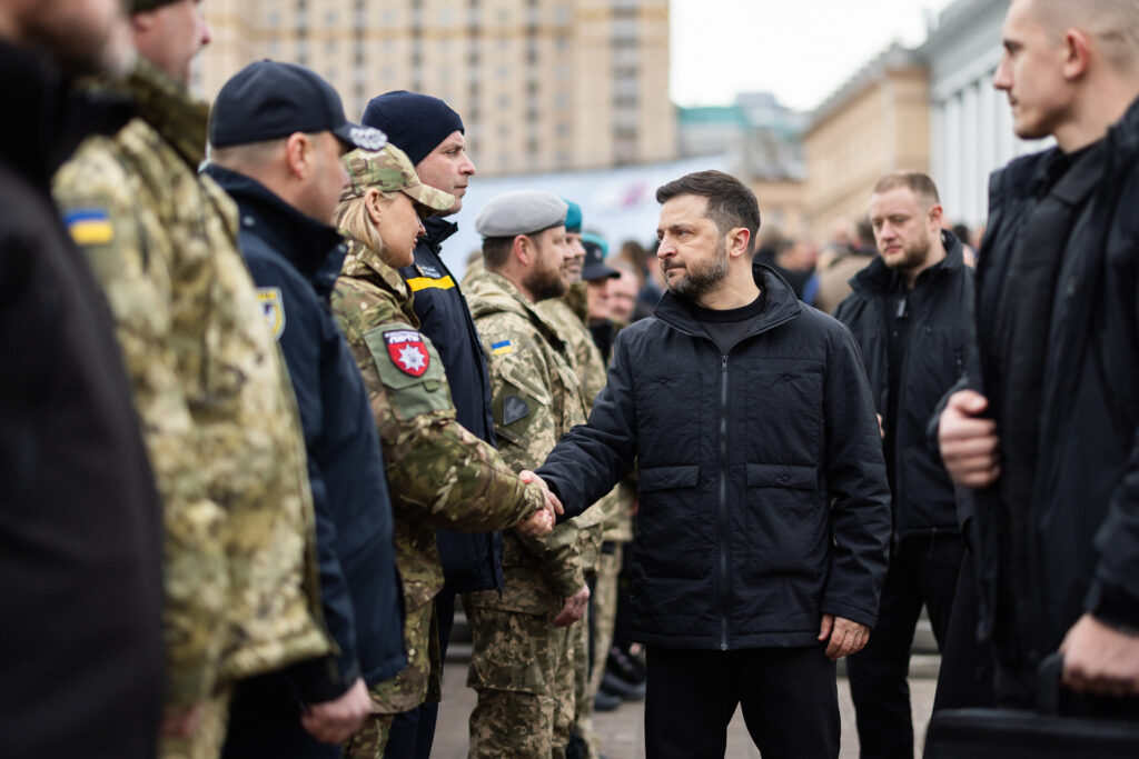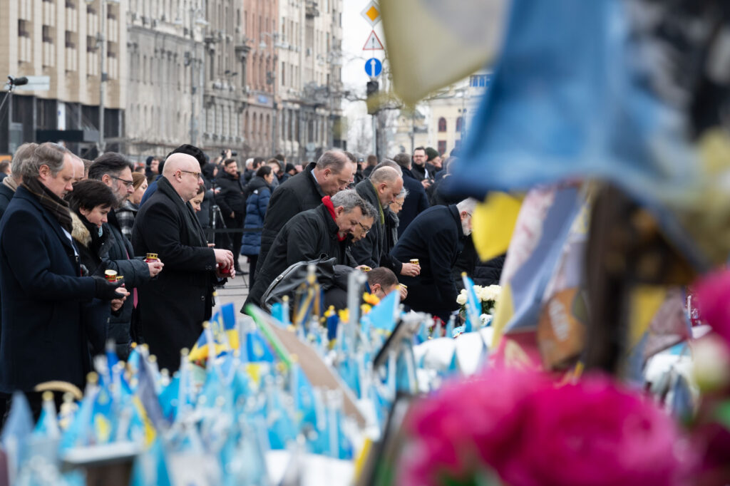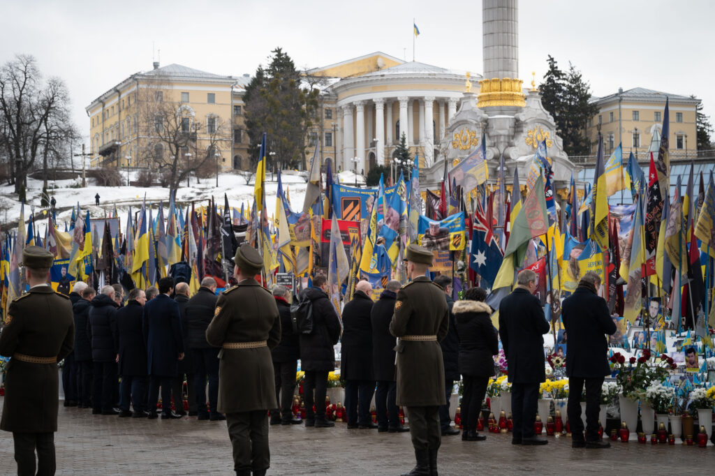 Президент України разом із першою леді та іноземними представниками на Майдані Незалежності 24 лютого 2026 року/Фото: Офіс президентаПрезидент України Володимир Зеленський із іноземними гостями, які прибули до Києва у четверту річницю початку повномасштабного вторгнення, вшанували на Майдані пам’ять полеглих героїв.