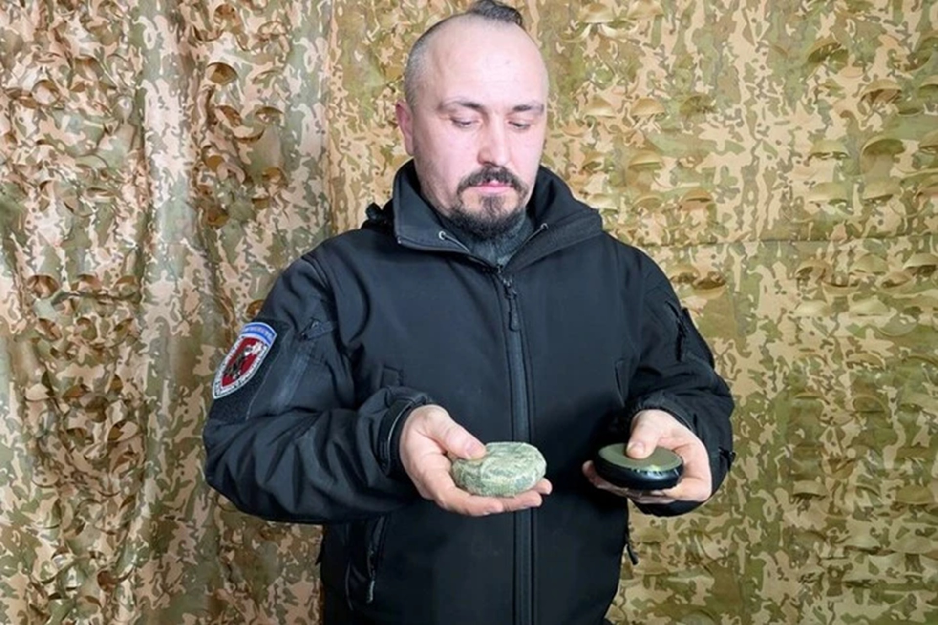 Начальник відділу вибухотехнічної служби поліції в Херсонській області Володимир Перепелиця показує міни "пряники", якими війська РФ дистанційно мінують Херсон / Фото: Суспільне