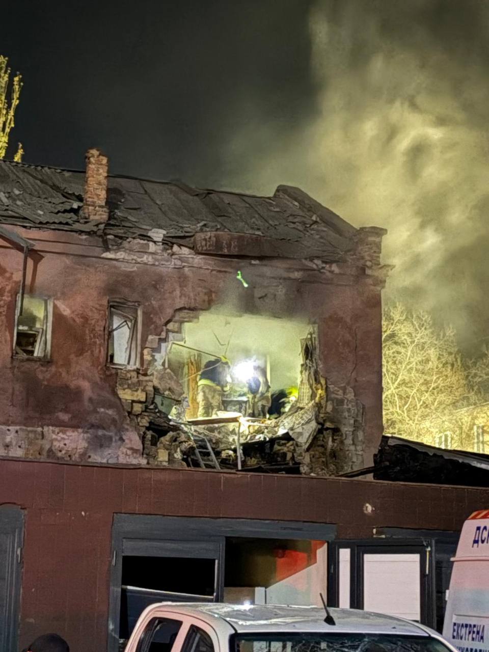 У ДСНС повідомили, що внаслідок влучання БпЛА у триповерховий житловий будинок зруйновано квартири та виникла пожежа. Ще два двоповерхові будинки зазнали руйнувань.