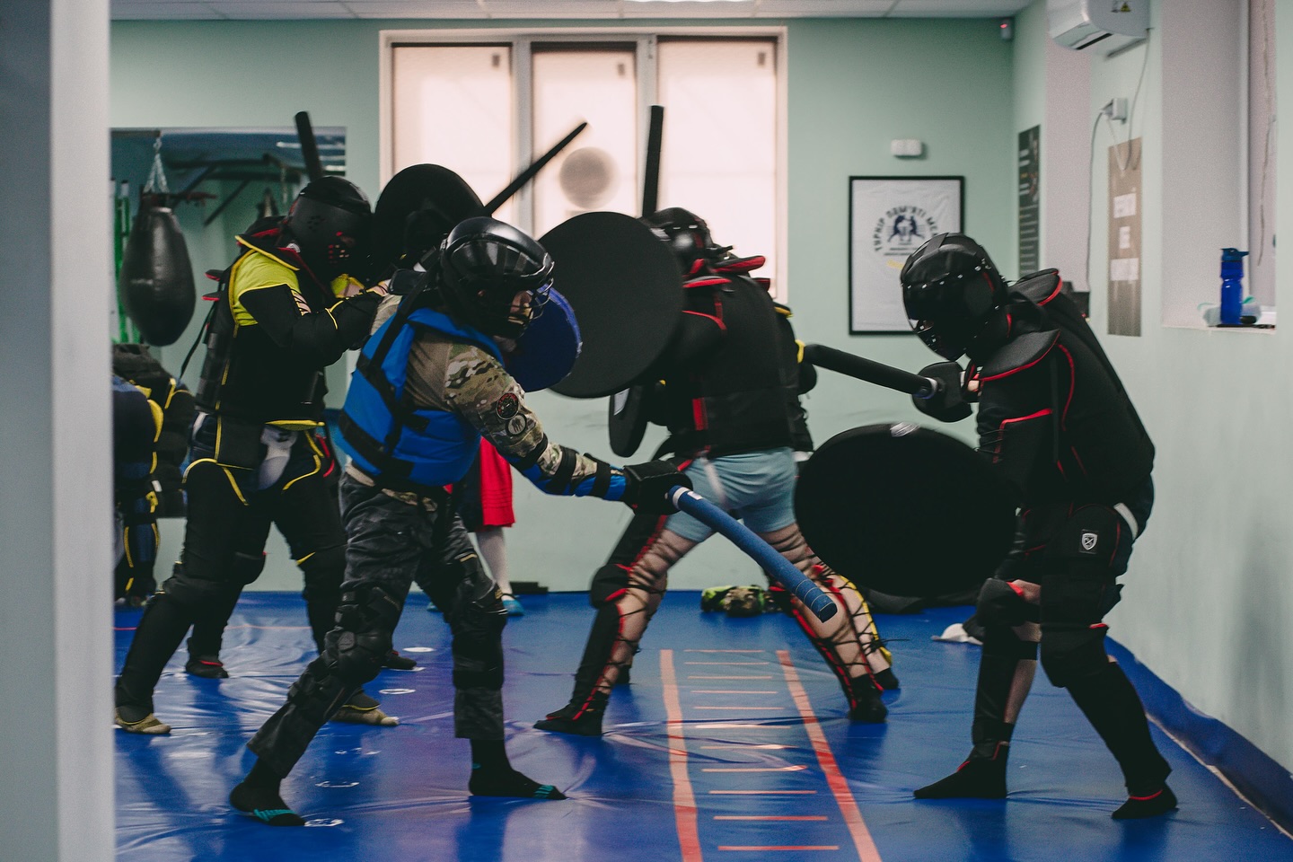 У розминку ми інтегруємо елементи тілесно-орієнтованої терапії. Часто до нас приходять люди у різних станах: хтось надто спокійний, хтось радикально навпаки. І для того, щоб зрівняти групу ми виконуємо різні вправи. Це допомагає зняти накопичену напругу, повернутися до себе реального, заземлитися. Деякі з них, наприклад, схожі на всім нам відомі «дихання по квадрату», «заземлення». Є елементи адаптивних вправ, тому що до нас долучаються люди з ампутаціями, на кріслах колісних, після поранень. Відповідно є елементи, що виконуються або повільніше, або по черзі, включається індивідуальний підхід. Саме тренування насправді відбувається як звичайне тренування — розминка, фізичні навантаження, заминку. Але оскільки ми пропонуємо адаптивний середньовічний бій, то тренуємось завжди у м’яких обладунках, не в сталевих.