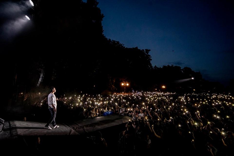 На світлинах – натовп глядачів з увімкненими ліхтариками, а лідер партії Святослав Вакарчук – з українським прапором. Це кадри з «Туру змін» до Полтави, з парку Перемоги, концертної, а не політичної частини.