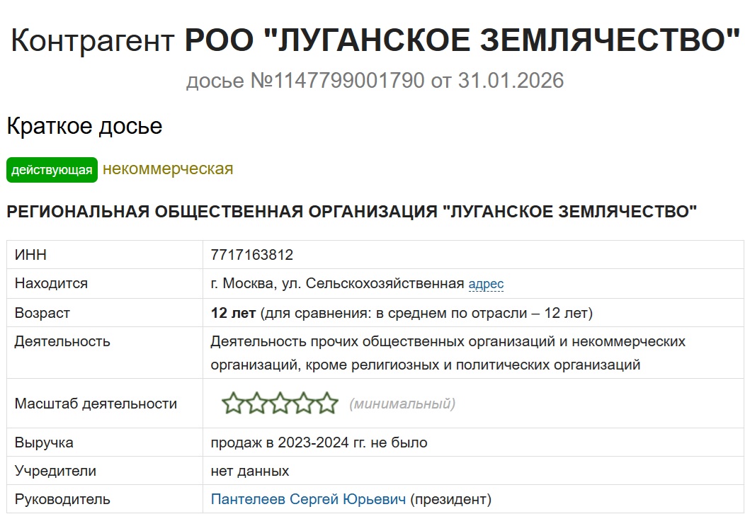 Цікавий факт, який часто ігнорують дослідники: сучасна юридична особа РГО «Луганское землячество» була офіційно внесена до російського реєстру (ЕГРЮЛ) саме на початку 2014 року. Це не було випадковістю. Саме тоді, коли в Україні перемагала Революція Гідності, Земляцтво було терміново переформатовано під нові завдання — підтримку сепаратистських рухів та легітимізацію «ЛНР» у російському інформаційному полі.