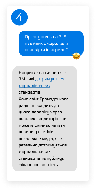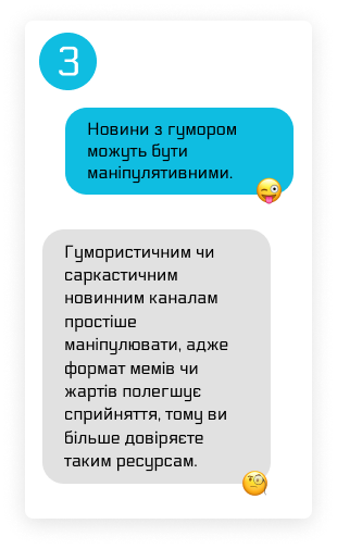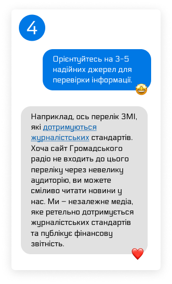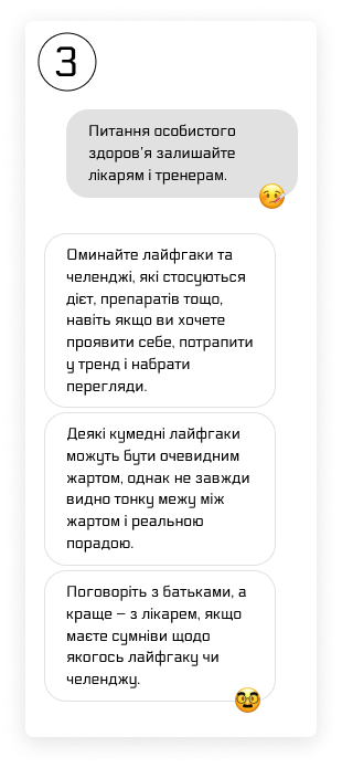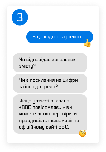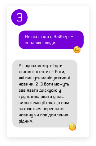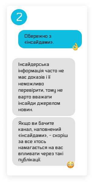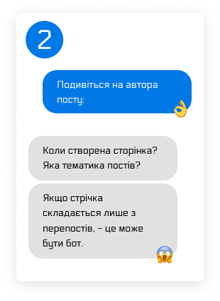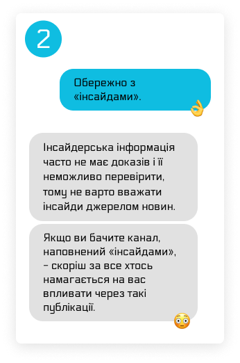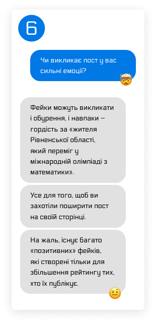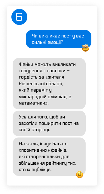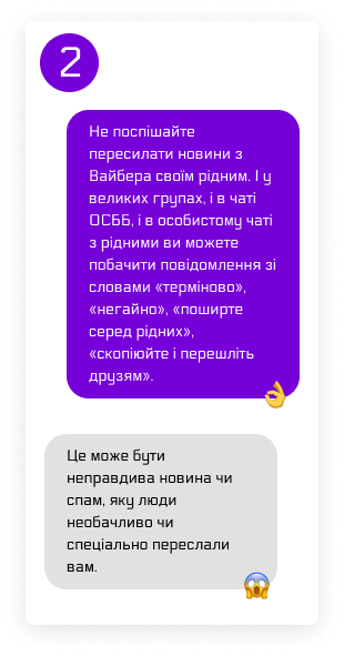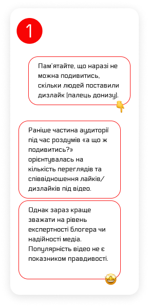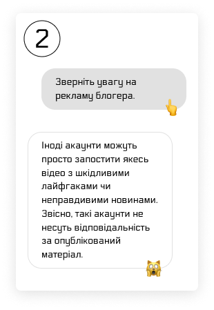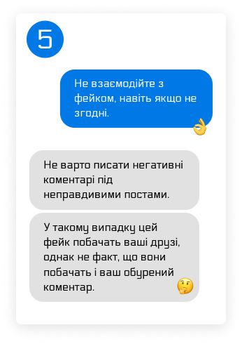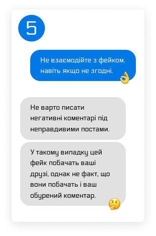 Уявіть ситуацію: ви натрапляєте на один фейк – ставите вподобайку, натрапляєте на другий – знову поставите вподобайку. Система подумає «значить, ось такого треба побільше», і ваша стрічка буде наповнюватись сумнівними постами. Вам буде здаватись, що всі довкола так думають, всі у вашій «інформаційній бульбашці» у це вірять.